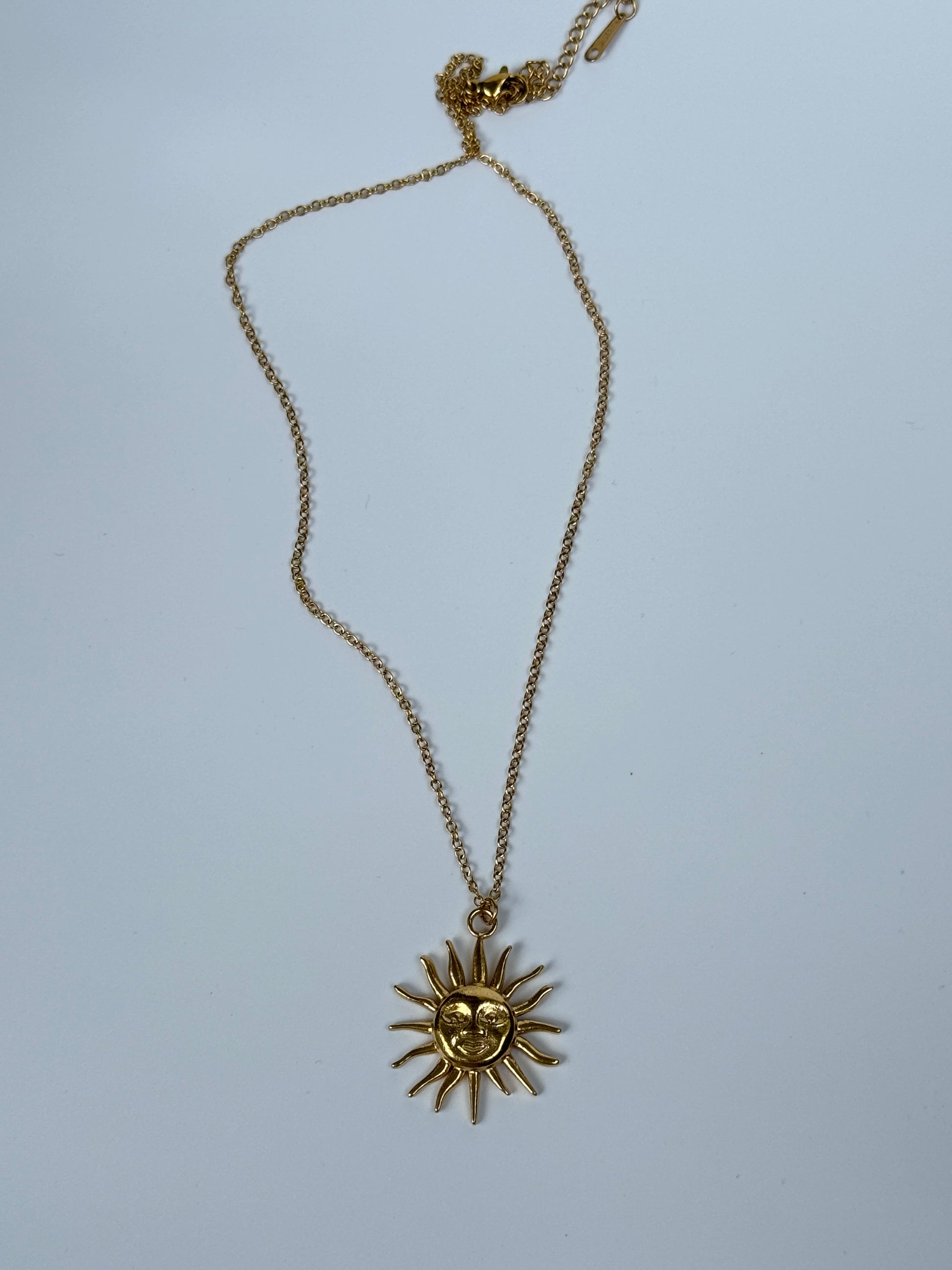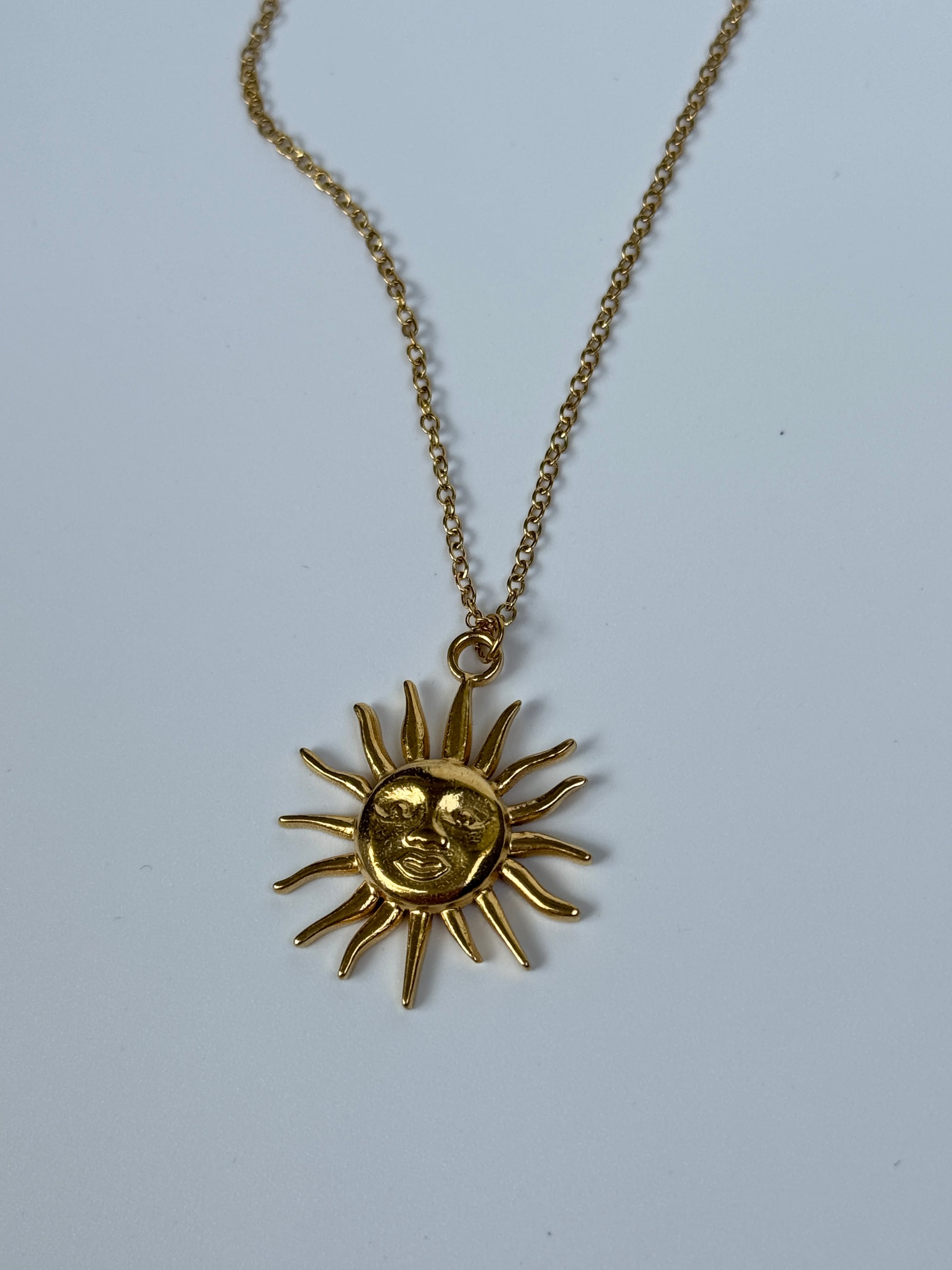 Diese elegante Halskette mit einem einzigartigen Sonnenanhänger verleiht Ihrem Outfit einen Hauch von Vintage-Charme. Der Anhänger ist fein gearbeitet und strahlt einen warmen, nostalgischen Glanz aus. Ideal für besondere Anlässe oder als tägliches Schmuckstück, das Ihre Persönlichkeit unterstreicht.